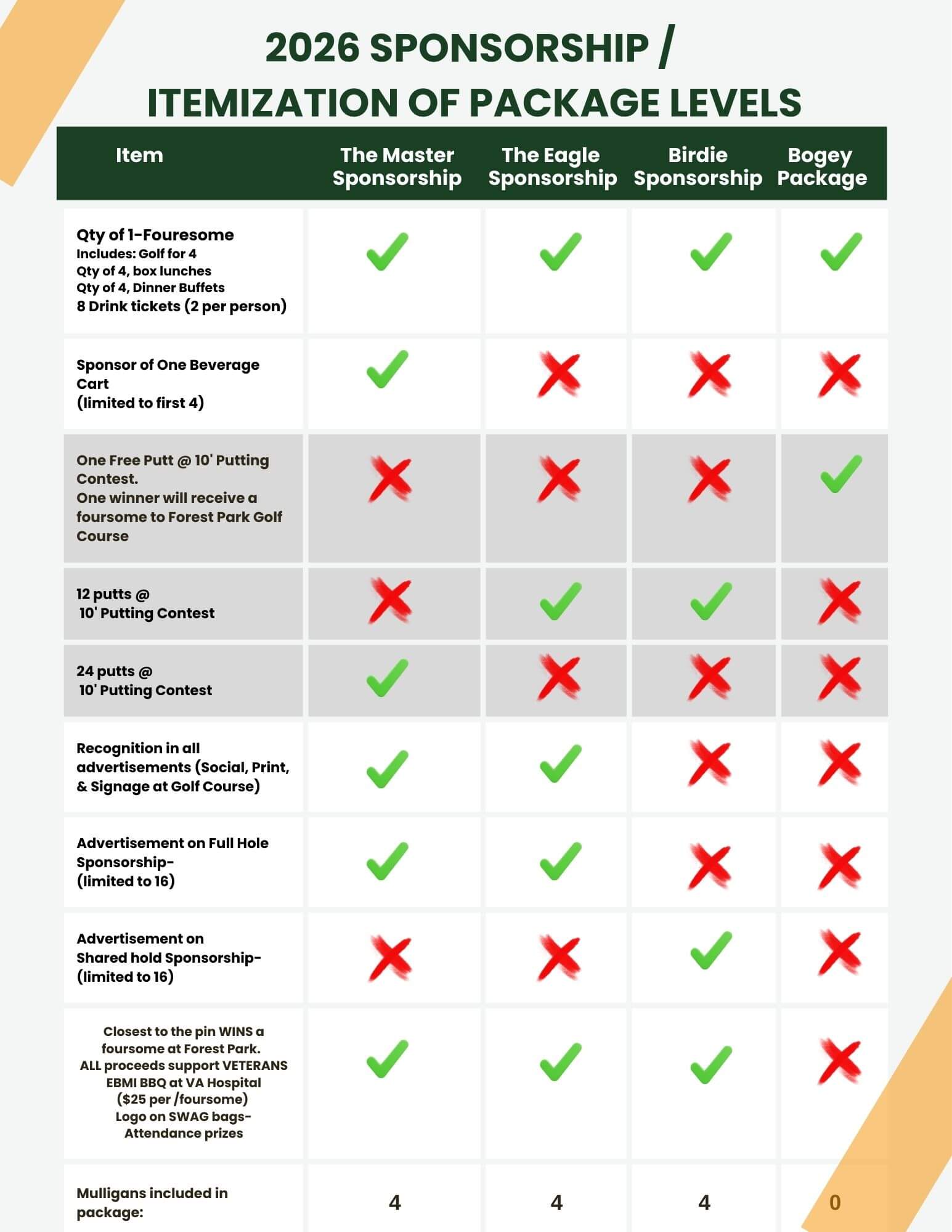 Includes Beverage Cart Sponsor, Full hole sponsorship, and 4person golf